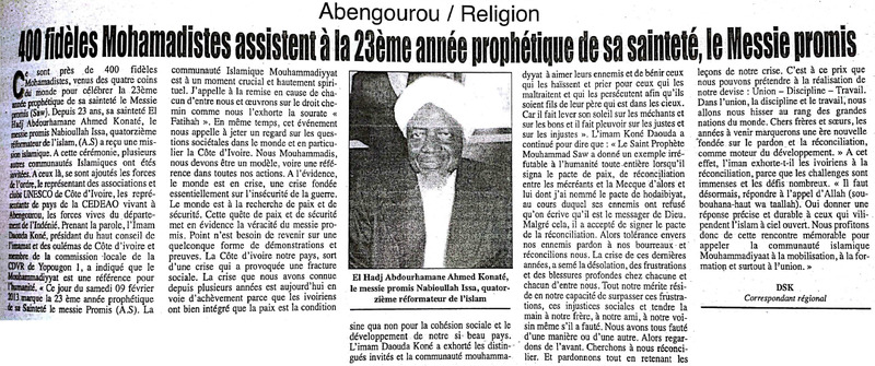 Abegourou / Religion : 400 fidèles Mohamadistes assistent à la 23ème année prophétique de sa sainteté, le Messie promis
