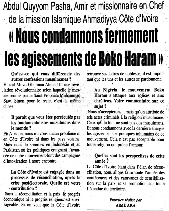 Abdul Quyyom Pasha, Amir et missionnaire en Chef de la mission Islamique Ahmadiyya Côte d'Ivoire : "Nous condamnons fermement les agissements de Boko Haram"