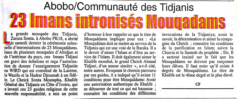 Abobo / Communauté des Tidjanis : 23 Imans intronisés Mouqadams