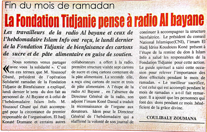 Fin du mois de ramadan : la Fondation Tidjanie pense à radio Al Bayane