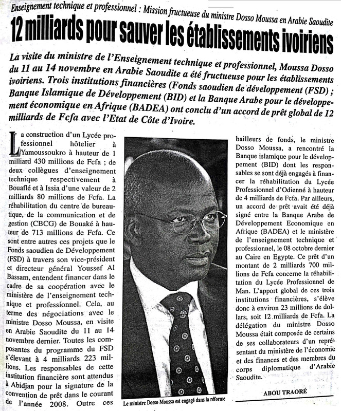 Enseignement technique et professionnel. Mission fructueuse du ministre Dosso Moussa en Arabie Saoudite : 12 milliards pour sauver les établissements ivoiriens