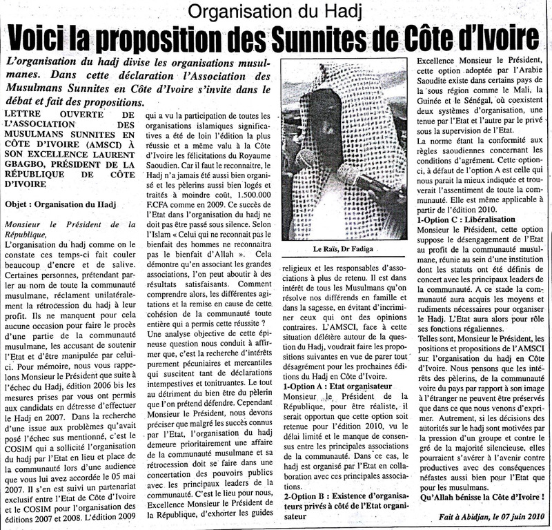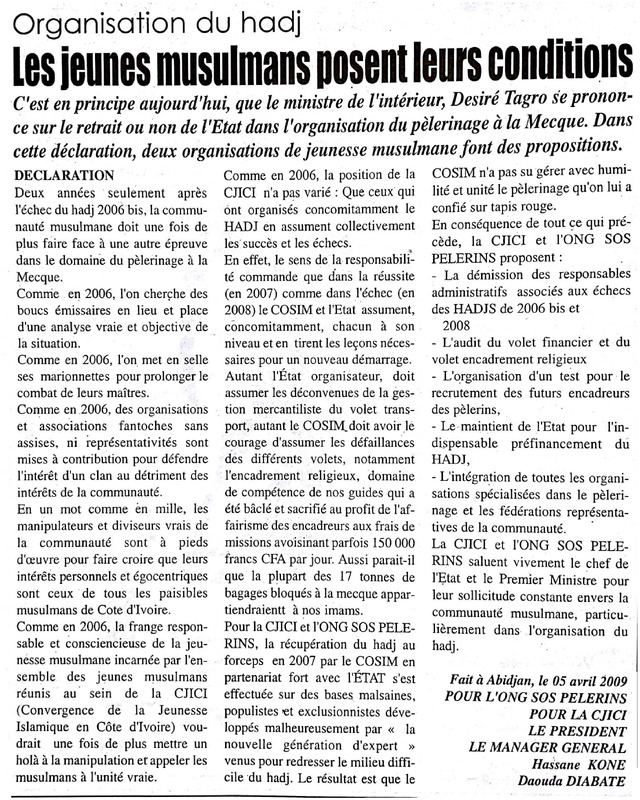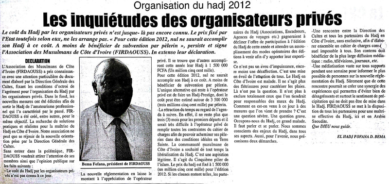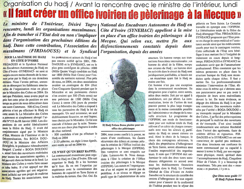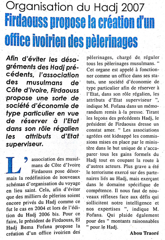 Organisation du Hadj 2007 : Firdaouss propose la création d'un office ivoirien des pèlerinages