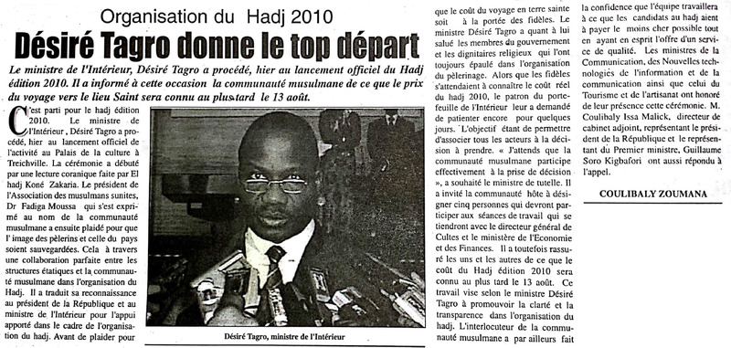 Organisation du Hadj 2010 : Désiré Tagro donne le top départ