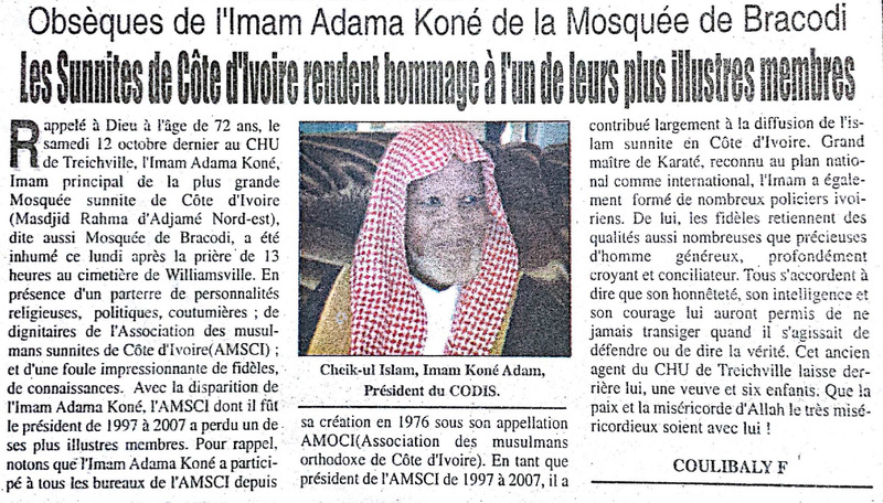 Obsèques de l'Imam Adama Koné de la Mosquée de Bracodi : les Sunnites de Côte d'Ivoire rendent hommage à l'un de leurs plus illustres membres