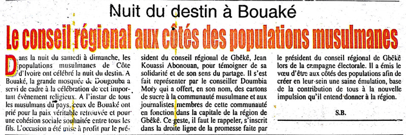 Nuit du destin à Bouaké : le conseil régional aux côté des populations musulmanes