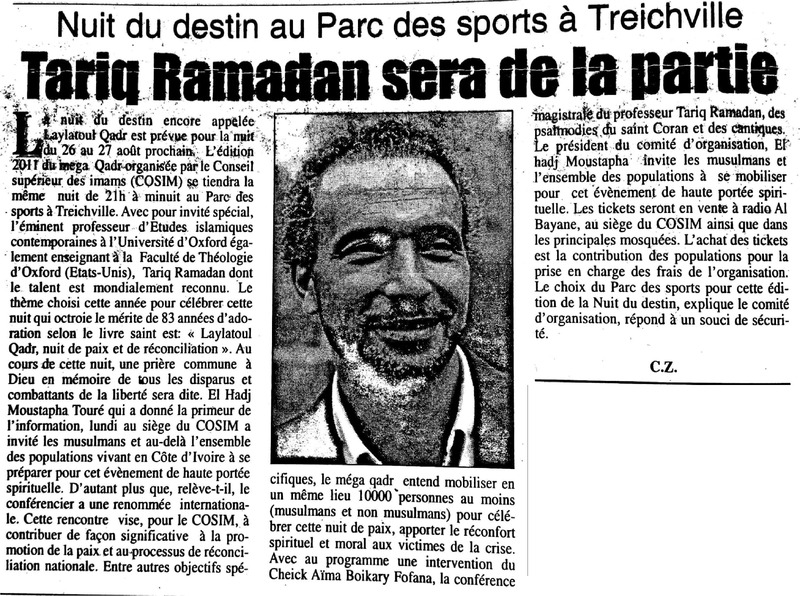 Nuit du destin au Parc des sports à Treichville : Tariq Ramadan sera de la partie