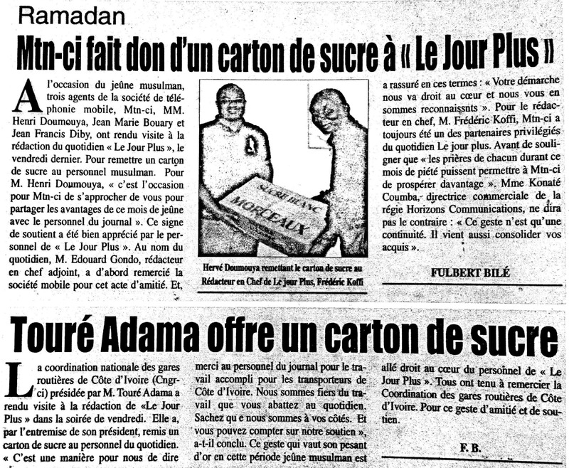Ramadan : Mtn-ci fait don d'un carton de sucre à "Le Jour Plus" / Touré Adama offre un carton de sucre