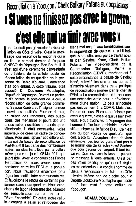 Réconciliation à Yopougon. Cheik Boikary Fofana aux populations : "Si vous ne finissez pas avec la guerre, c'est ele qui va finir avec vous"