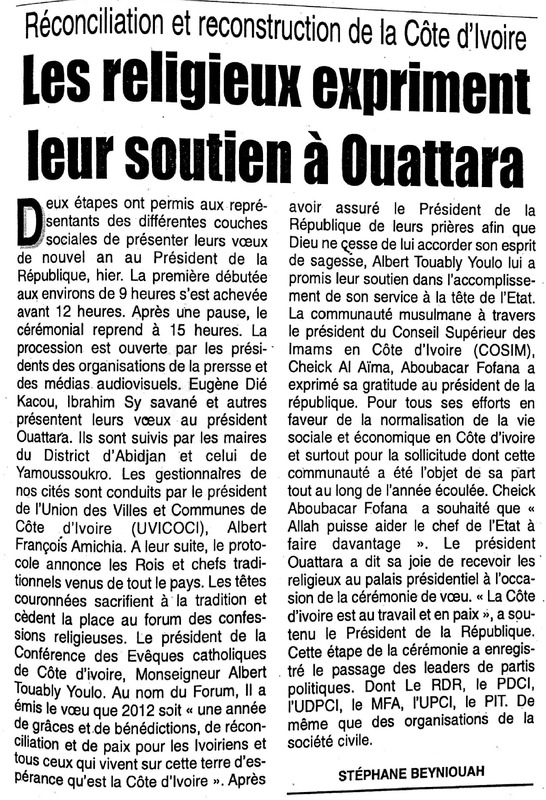 Réconciliation et reconstruction de la Côte d'Ivoire : les religieux expriment leur soutient à Ouattara