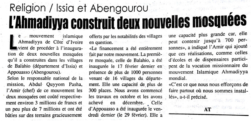 Religion / Issia et Abengourou : l'Ahmadiyya construit deux nouvelles mosquées