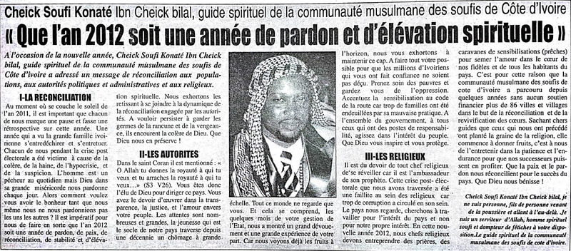 Cheick Soufi Konaté Ibn Cheick bilal, guide spirituel de la communauté musulmane des soufis de Côte d'Ivoire : "Que l'an 2012 soit une année de pardon et d'élévation spirituelle"