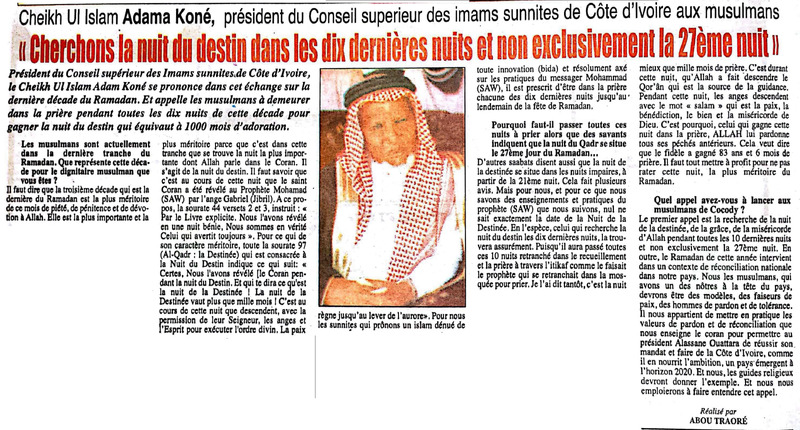 Cheikh Ul Islam Adama Koné, président du Conseil supérieur des imams sunnites de Côte d'Ivoire aux musulmans : "Cherchons la nuit du destin dans les dix dernières nuits et non exclusivement la 27ème nuit"