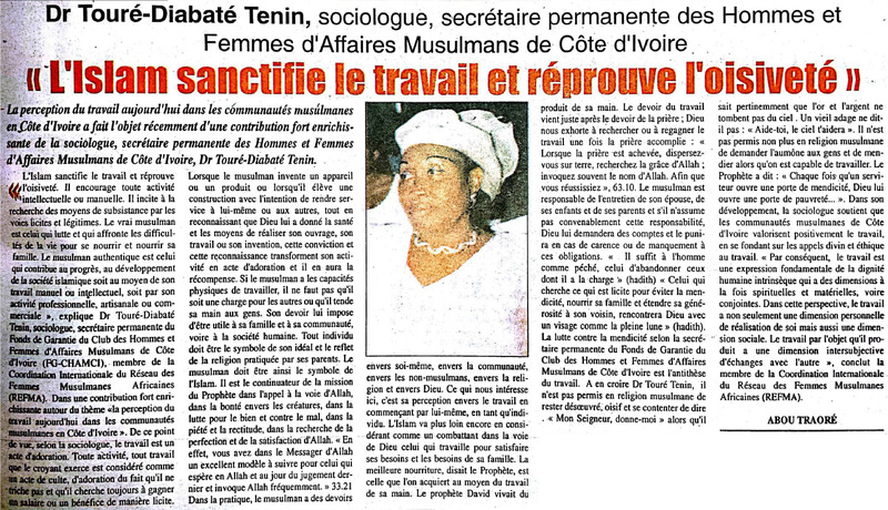 Dr Touré-Diabaté Tenin, sociologue, secrétaire permanente des Hommes et Femmes d'Affaires Musulmans de Côte d'Ivoire : "L'Islam sanctifie le travail et réprouve l'oisiveté"