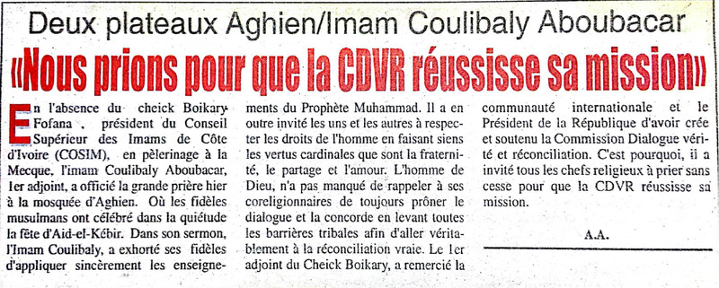 Deux plateaux Aghien / Imam Coulibaly Aboubacar : "Nous prions pour que la CDVR réussisse sa mission"