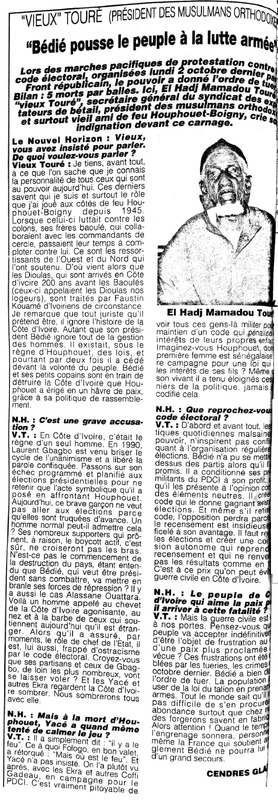 "Vieux Touré" (président des musulmans orthodoxes) : "Bédié pousse le peuple à la lutte armée"