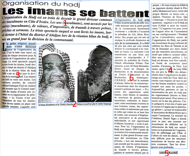 Traditional OCR tools are optimised for modern, well-structured documents such as letters and books. These tools rely on geometric assumptions, such as rectangular blocks and consistent alignments, which do not apply to newspapers due to their non-linear flow, multi-column structure and visual hierarchy. Although models can be trained to recognise layouts more effectively, the diversity of fonts, styles and formats across publications and decades makes this impractical for IWAC. In African archives, material degradation exacerbates the problem. Manual intervention was therefore essential, involving cropping relevant articles from full pages and tracing text flow through columns and continuations.